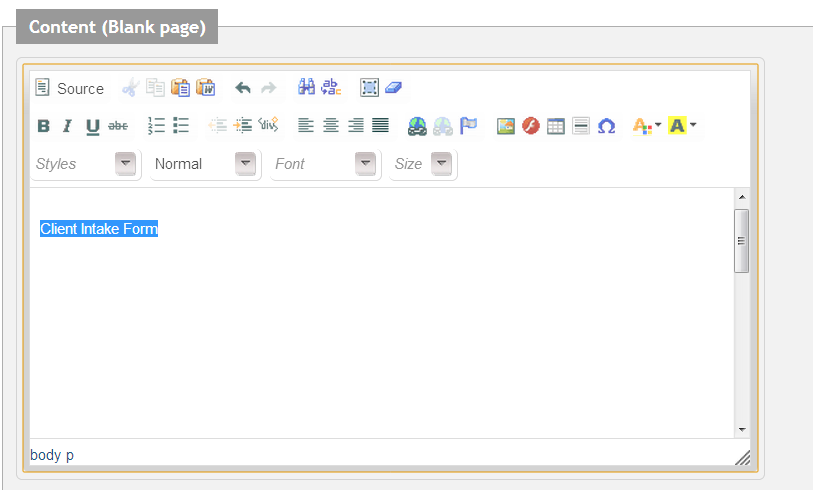 STEP 4: The Editor will appear allowing you to type the name of the link as you want it to appear on your website. For example, “Client Intake Form” and highlight the text.