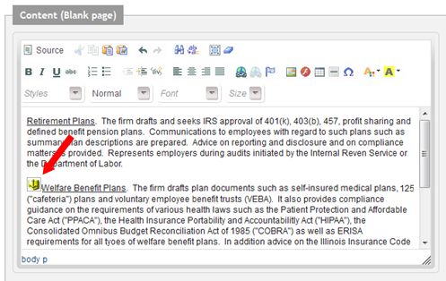 STEP 5: To create the anchor on a webpage within your website, place your cursor before the text or section you want to link the anchor to. In this example, we have simply placed the cursor immediately before the phrase “Welfare Benefit Plans”. The "i-bar" is in front of the "W":